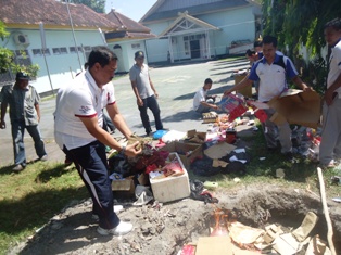 Selain pemusnahan barang bukti obat, pihaknya juga memusnahkan BB kasus kejahatan lainnya. Di antaranya setengah kilogram ganja, 2 gram shabu, dan 40 lembar uang palsu pecahan 100 ribu. “Semua pelakunya termasuk 8 pelaku narkoba telah divonis dan kasusnya telah berkekuatan hukum tetap,” demikian Kajari. (*)