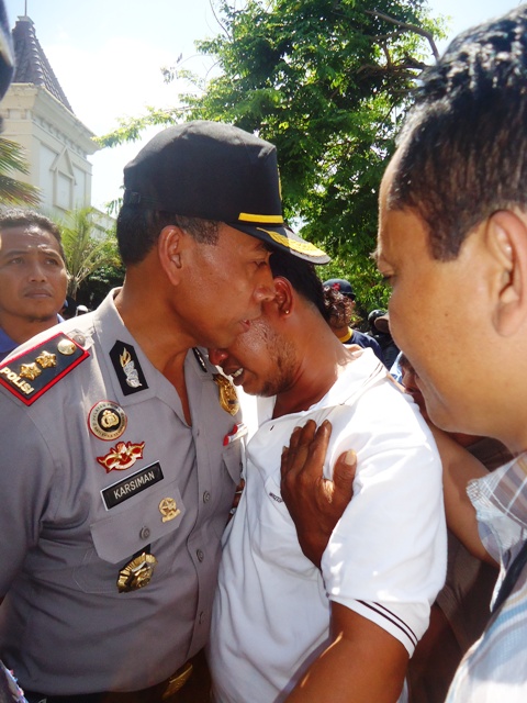 Terhadap hal ini Kapolres AKBP Karsiman memberikan pemahaman kepada Indi baik menyangkut persoalan hukum terkait eksekusi maupun resiko yang akan timbul jika pihak kalah (Indi Cs) tetap mempertahankan bangunan tersebutt. Upaya Kapolres ini membuat Indi yang didampingi keluarganya, luluh dan seketika menangis tersedu-sedu sambil memeluk Kapolres. Indi juga yang membujuk keluarga dan ‘pendukungnya’ yang berada di dalam rumah segera keluar dan mengosongkan bangunan. “Menyelesaikan masalah harus mengedepankan upaya persuasif karena komunikasi yang indah lebih utama daripada tindakan represif,” ucap Kapolres. (*) Baca juga di Gaung NTB