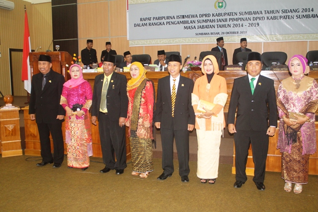Empat pimpinan DPRD Sumbawa periode 2014-2019 resmi dilantik, Senin (20/10). Pelantikan melalui Sidang Paripurna Isitimewa DPRD Sumbawa ini berdasarkan SK Gubernur Provinsi NTB No. 171-642 tahun 2014 tentang Peresmian Pengangkatan Pimpinan DPRD Kabupaten Sumbawa. Mereka adalah Lalu Budi Suryata SP selaku Ketua DPRD Sumbawa, sedrfta tiga orang wakil ketua yaitu Drs A Rahman Alamudy SH M.Si, H Ilham Mustami S.Ag, dan Kamaluddin ST M.Si.