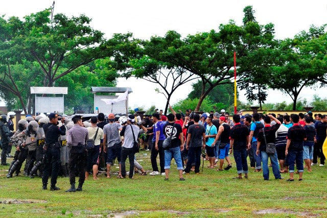 Sementara itu puluhan personil Brimob dikerahkan untuk menetralisir situasi. Kehadiran aparat ini semakin memancing emosi warga. Situasi yang kalut memaksa polisi melepas tembakan peringatan, namun warga tak beranjak bahkan melakukan perlawanan dengan melakukan pelemparan. Akibatnya beberapa anggota mengalami luka memar tertimpuk batu. Akhirnya polisi melepas gas air mata sehingga warga membubarkan diri. Situasi terkendali sekitar pukul 24.00 Wita sekaligus penarikan anggota di lapangan.