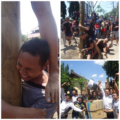 Kocak dan meriah. Itulah suasana yang tersaji pada perlombaan panjat pinang yang digelar Polres Sumbawa, belum lama ini. Meski hanya melibatkan fungsi di internal jajaran setempat plus anggota Brimob, namun kebahagiaan terbagi untuk masyarakat yang ikut menyaksikannya. Kapolres Sumbawa, AKBP Karsiman SIK MM didampingi Ny Anna Karsiman, Wakapolres dan petinggi lainnya ikut terpingkal-pingkal melihat ulah kocak para peserta. Tiang pohon pinang yang dilumuri pelumas berubah licin bak belut membuat para peserta kesulitan untuk mencapai puncak yang menjuntai beraneka hadiah menarik di ketinggian sekitar 15 meter.