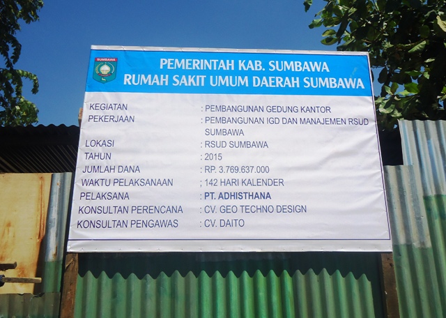 Pantauan SAMAWAREA, pengerjaan proyek itu masih dalam tahap pengurukan tanah untuk pondasi bangunan. Proyek pembangunan kantor IGD dan manajemen RSUD ini dikerjakan PT Adhisthana dengan menelan anggaran APBD Sumbawa Tahun 2015 sebesar Rp 3.769.637.000 (3,77 Milyar) dengan masa pengerjaan 142 hari kalender. “Lantai I untuk pelayanan IGD, lantai duanya dijadikan kantor manajemen,” kata Kepala Bagian Tata Usaha (Kabag TU) RSUD Sumbawa, H Ahmadi SE yang ditemui Rabu (19/8).