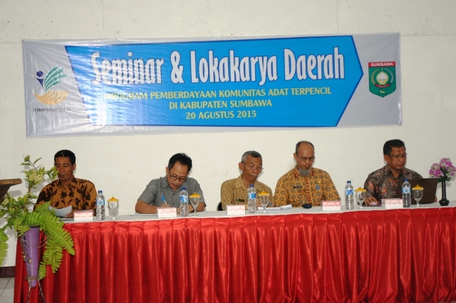 Pemerintah Kabupaten Sumbawa melalui Dinas Sosial Kabupaten Sumbawa bekerjasama dengan Kementerian Sosial RI menggelar Semiloka KAT (Komunitas Adat Terpencil). Kegiatan yang dilaksanakan di Hotel Cendrawasih Sumbawa, Kamis (20/8) ini dihadiri Bupati yang diwakili Staf Ahli Bupati bidang SDM dan Kemasyarakatan, utusan Kementerian Sosial RI, para pejabat dari Dinas Sosial dan Dukcapil Provinsi NTB, dan kalangan akademisi dari UNRAM/LPPM selaku ketua tim dan para peserta semiloka.
