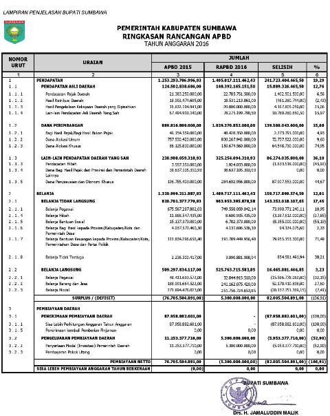 Dengan demikian pembiayaan netto sebesar minus 5 milyar 300 juta rupiah. Pembiayaan netto ini ditutupi dari surplus pendapatan, sehingga posisi sisa lebih pembiayaan anggaran tahun berkenaan menjadi nol rupiah. Dari penjelasan tersebut, tergambar bahwa struktur belanja dalam RAPBD Tahun Anggaran 2016 adalah 64,71 persen teralokasikan untuk Belanja Tidak Langsung dan 35,29 persen untuk Belanja Langsung. Masih rendahnya proporsi belanja langsung dibandingkan dengan belanja tidak langsung tersebut lebih disebabkan karena kebijakan penganggaran pemerintah pusat yang mempengaruhi postur RAPBD 2016 seperti kebijakan penganggaran Tunjangan Profesi Guru PNSD, Tambahan Penghasilan Guru PNSD, Bagi Hasil Pajak Daerah dan Retribusi Daerah kepada Pemerintah Desa, Alokasi Dana Desa dan Dana Desa yang cukup besar kontribusinya terhadap peningkatan proporsi belanja tidak langsung. Adapun ringkasan rencana anggaran pendapatan dan belanja daerah tahun anggaran 2016 disertakan sebagai lampiran penjelasan ini.