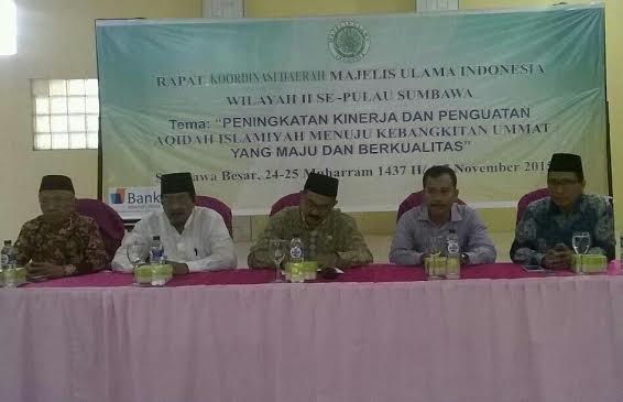 “Peningkatan Kinerja dan Penguatan Aqidah Islamiyah Menuju Kebangkitan Ummat yang Maju dan Berkualitas” adalah tema Rapat Koordinasi Daerah Majelis Ulama Indonesia Wilayah II Pulau Sumbawa Tahun 1473 H/ 2015 M. Kegiatan yang digelar di Hotel Dewi Sumbawa, Jumat (6/11) sore sekitar pukul 15.30 Wita, dihadiri Ketua umum MUI Provinsi NTB Prof Drs Saiful Muslim, Kapolres Sumbawa yang diwakili Kasat Intelkam AKP Hatta, S.IP, Bupati Sumbawa diwakili Asisten II Drs H Muhammading, Ketua KPU Sumbawa, Syukri Rahmat S.Ag, Ketua MUI Cabang Sumbawa Drs H Nadi Husain, dan Sekretarisnya H Faisal Salim S.Ag serta 60 orang tamu undangan.