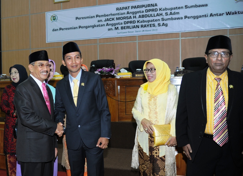 Pelantikan Berlian Rayes S.Ag M.Si sebagai Anggota DPRD Sumbawa menggantikan Jack Morsa S.Adm, Senin (28/3) tadi, disambut sukacita Ketua DPD Golkar Kabupaten Sumbawa, Dr. Drs. A. Rachman Alamudy, SH., M.Si. Sebab secara tidak langsung kehadiran Berlian Rayes, semakin menguatkan armada fraksi Golkar di DPRD yang kini diawaki 6 kekuatan. “Alhamdulillah, pelantikan sudah selesai,” kata Doktor Abi Mang—sapaan Ketua Golkar yang juga salah satu pimpinan DPRD Sumbawa kepada SAMAWAREA, pagi tadi.