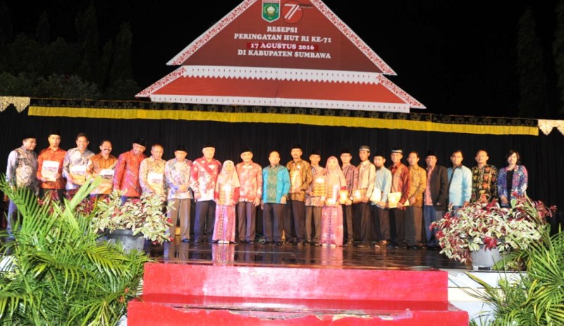Meski diguyur hujan deras, Resepsi Peringatan Hari Ulang Tahun Republik Indonesia ke-71 di Lapangan Pahlawan Sumbawa, Rabu (17/8) malam terus berlangsung dan berjalan lancar. Hadir dalam acara tersebut, Wakil Bupati Sumbawa, Pimpinan Forkopimda Kabupaten Sumbawa, Pimpinan Yayasan Dea Malela Prof. Dr. Din Syamsuddin, Kepala SKPD, camat, toga dan toma. Acara dibuka dengan pembacaan Kalam Illahi oleh Murattilah terbaik I Cabang Tilawah Al Qur’an Golongan Tartil tingkat Nasional asal Kabupaten Sumbawa, Syifa Fadiyah Maulida.