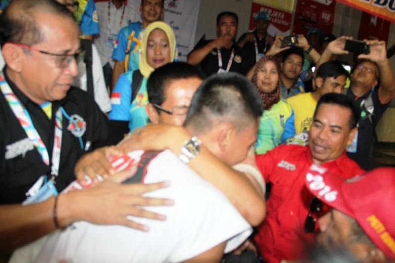 Suasana haru di GOR Padjajaran Bandung, Rabu (28/9) tak bisa dibendung ketika Kurniawan (Awan) atlet Boxer NTB menambah medali menjadi 11 emas. Awan—sapaannya yang memang atlet andalan dengan akurasi pukulan kerasnya yang selalu membuat lawannya KO berteriak sambil berlari ke kontingen NTB di atas tribun setelah berhasil mengkanvaskan petarung Jawa Timur Jenar Y. Petarung berusia 21 tahun asal Kecamatan Moyo Hilir, Kabupaten Sumbawa, Nusa Tenggara Barat ini langsung memeluk Ketua KONI Kabupaten Sumbawa H Mustami Hamzah B.Sc SH. Mustami yang sejak pagi mengikuti pertandinagn kelas demi kelas, juga memeluk erat Awan. Keduanyapun tak bisa membendung air mata. Para suporter NTB di sela-sela kegembiraannya ikut terharu bercampur bahagia. Ketua KONI NTB, Andi Hadyanto-pun tak luput dari pelukan Awan juga larut dalam kebahagiaan. Puluhan suporter NTB langsung meneriakkan yel-yel ‘’hidup NTB’’ melawan riuhnya GOR Padjajaran. ‘’Alhamdulillah. Semua ini adalah kehendak Allah SWT. Saya terharu bercampur bahagia atas prestasi para atlet yang memang benar-benar mempertaruhkan kemampuannya. Di level nasional setingkat PON ini adalah ajang tempat mengukur sekaligus menjawab hasil yang dilakukan selama ini,’’ kata Mustami di luar GOR Padjajaran.