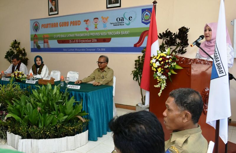Sementara itu, Kepala Dinas Tenaga Kerja dan Transmigrasi Provinsi NTB Drs. H. Wildan sekaligus Ketua Panitia menyampaikan bahwa tujuan Pelatihan guru PAUD adalah untuk membekali peserta (Guru Paud) agar memiliki kemampuan mengajar yang menarik dan menyenangkan bagi anak-anak usia dini. Pelatihan Guru PAUD Tahun 2016 diikuti oleh 30 peserta dari 15 PAUD yang terdiri dari Kabupaten Dompu 7 PAUD sebanyak 14 orang, Kabupaten Bima 7 PAUD sebanyak 14 orang, dan Kabupaten Sumbawa Barat UPT Transmigrasi Tongo 1 PAUD sebanyak 2 orang. Materi Pelatihan Guru PAUD diberikan oleh Indonesia Heritage Foundation.