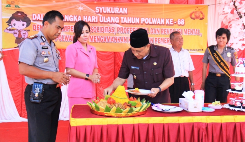 Puluhan polisi wanita (Polwan) di lingkup Polres Sumbawa menggelar acara syukuran atas hari jadinya ke-68 di halaman Mapolres setempat, Kamis (1/9). Acara yang ditandai dengan pemotongan tumpeng dan dibuka dengan persembahan tarian para Polwan ini dihadiri Wakil Bupati Sumbawa, Kajari, Ketua Komisi I DPRD, dan Pimpinan BUMD/BUMN.