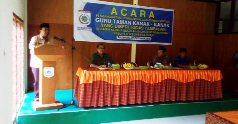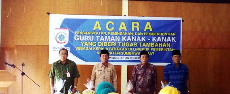 Kepala Dinas Kebudayaan Pemuda dan Olahraga (Dikbudpora) KSB, Drs. Mukhlis menyampaikan selamat bertugas kepada kepala TK negeri yang baru dilantik. Ia berharap TK yang dipimpin pejabat baru ini dapat melaksanakan tugasnya dengan ikhlas, jujur dan bersungguh-sungguh. “Kami yakin, di bawah kepemimpinan bapak dan ibu-ibu TK di sini akan lebih baik karena kami sudah menyeleksi sesuai dengan kemampuan masing-masing sehingga diharapkan pendidikan di KSB akan lebih baik,” kata Mukhlis, seraya menyebut SK Bupati, No. 080/ 824/BK.DIKLAT/2016 yaitu tentang pengangkatan, pemindahan, dan pemberhentian guru TK yang diberikan tugas tambahan sebagai kepala sekolah di lingkup KSB.