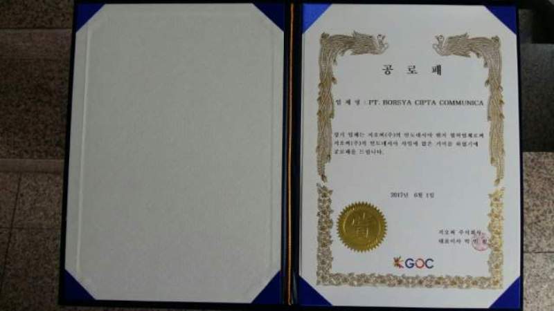 Pada kesempatan itu, Direktur Utama/CEO GOC Korea juga memberikan Sertifikat Penghargaan kepada Direktur Utama/CEO PT. Borsya Cipta Communica, Boris Syaifullah, sebagai bentuk apresiasi karena prestasinya mampu menjadi distributor terbesar dalam tahun ini dan melampaui target maksimum pengadaan Material Fiber Optic khususnya Dropwire Cable. Selain itu, Mr. Park In Chul juga memberikan support dalam bentuk bantuan hibah satu unit mesin senilai Rp 400 juta untuk digunakan PT BCC sehingga dapat menunjang target produksi yang semakin tinggi di Indonesia.