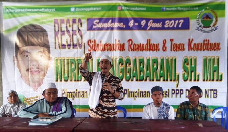 Nurdin Ranggabarani SH MH–Pimpinan Komisi IV DPRD NTB telah menuntaskan kegiatan resesnya di enam titik pertemuan selama 6 hari, 4—9 Juni 2017. Reses itu diawali dari Kecamatan Sumbawa di Aula Pertemuan Sekretariat DPC PPP Sumbawa, dilanjutkan ke Kecamatan Utan, Buer, Alas dan Alas Barat. Reses pamungkas dilaksanakan di Pondok Pesantren Tahfizul Qur’an Rohmatan Lil’alamin, Desa Gontar Baru Kecamatan Alas Barat.