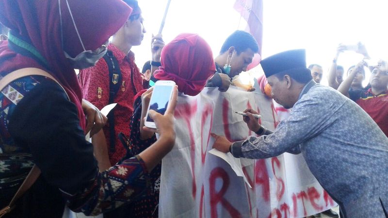 Untuk mendukung aspirasi mahasiswa yang menolak Perppu Ormas, Wabup juga turut serta membubuhkan tandatangan di spanduk putih yang disiapkan massa aksi. “Aspirasi adik-adik IMM dan HMI KSB ini akan saya sampaikan baik secara langsung ketika saya ke Jakarta, maupun via telpon,” janjinya.