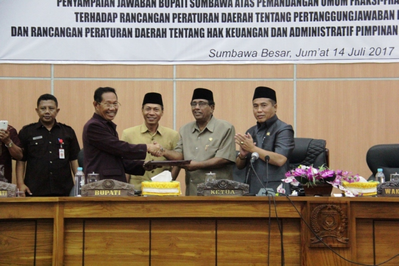 Pemda Kabupaten Sumbawa memaknai secara piositif, konstruktif dan menjadi masukan yang sangat berharga semua pandangan fraksi di DPRD Sumbawa dalam upaya meningkatkan kualitas pengelolaan APBD khususnya, penyelenggaraan pemerintahan dan pelaksanaan pembangunan di daerah secara umum.