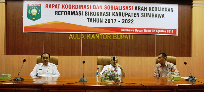 Sebelumnya Kepala Bagian Organisasi Sekretariat Daerah Kabupaten Sumbawa, diwakili Dr. Budi Prasetio,S.AP.,M.AP melaporkan bahwa Kabupaten Sumbawa telah ditetapkan sebagai pilot project (proyek percontohan) dalam pelaksanaan Reformasi birokrasi bersama dengan Pemerintah Provinsi Nusa Tenggara Barat, dan Pemerintah Kota Mataram. Rapat koordinasi ini diikuti oleh seluruh Kepala Organisasi Perangkat Daerah, para Camat, Kabag, dan Lurah se Kabupaten Sumbawa. (JEN/SR)