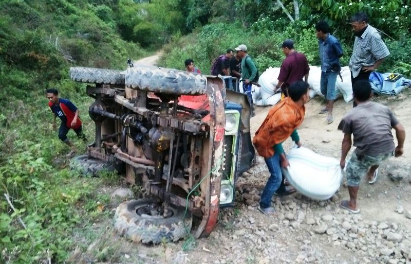 Sebuah hardtop terguling di jalan wilayah Desa Tangkampulit Kecamatan Batu Lanteh, Jumat (18/8) siang tadi. Tidak ada korban jiwa dalam kejadian meski hardtop full muatan dan ditumpangi sejumlah orang. Medan yang sulit dan jalan rusak menjadi penyebab kecelakaan tersebut. Selain tanjakan, jalan itu berbatuan dan lubang di sana-sini. Kecelakaan sering terjadi di lokasi tersebut. Meski sopir sudah terbiasa dan cukup lincah, pasti merasakan ganasnya jalan itu.