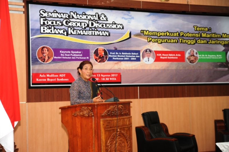 Menteri Kelautan dan Perikanan Republik Indonesia, Susi Pudjiastuti salut dengan potensi kemaritiman di Kabupaten Sumbawa. Bahkan potensi ini telah menjadikan Sumbawa sebagai kabupaten sentra produksi rumput laut dan udang nasional. Prestasi ini tidak mungkin diraih tanpa pengelolaan pontensi kelautan secara maksimal. Karena itu Ia memuji Bupati Sumbawa sebagai seorang pemimpin yang mampu memaknai poin-poin yang dibicarakan dan menjadi program kementerian kelautan dan perikanan. “Saya yakin dengan Muspida yang dipimpin oleh seorang Bupati seperti ini mampu mempercepat pembangunan dari ekonomi kemaritiman,” ungkap Menteri Susi saat menjadi keynote speaker dalam Seminar Nasional dan FGD Bidang Kemaritiman Forum Rektor Indonesia (FRI) di Kantor Bupati Sumbawa, Sabtu (12/8).