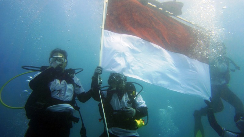 Teluk Benete, Maluk, Sumbawa Barat (17/8), menjadi tempat bagi penyelam yang tergabung dalam Sumbawa Diving Club (SDC) Batu Hijau mengibarkan bendera merah putih di bawah air. Di kedalaman 10 meter, 20 penyelam menyiapkan tempat dan posisi dimana lokasi yang stabil sebagai landasan tali bendera agar tetap kokoh, kuat dan berkibar dengan sempurna digoyang arus air laut.