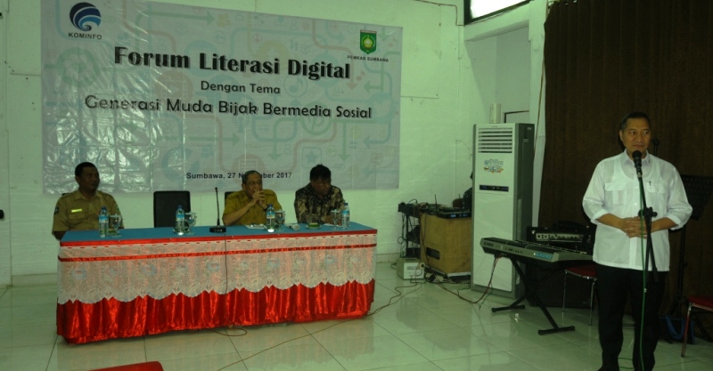 Kementerian Komunikasi dan Informatika melalui Dirjen Informasi dan Komunikasi melaksanakan kegiatan Forum Literasi Digital di Kabupaten Sumbawa, Senin (27/11). Kegiatan bertema “Generasi Muda Bijak Bermedia Sosial” ini dibuka secara resmi oleh Wakil Bupati Sumbawa, dan dihadiri pula Anggota DPR RI H. M. Syafruddin ST dan Direktur Pengelolaan dan Penyediaan Informasi Ditjen IKP Kementerian Kominfo, Drs. Selamatta Sembiring di Aula Hotel Tambora Sumbawa Besar.