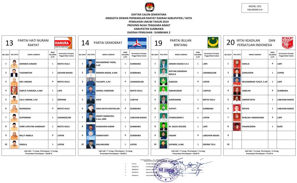 Daftar Calon Sementara Anggota DPRD Kabupaten Sumbawa Dapil 2 Pemilu 2019 Agustus 12, 2018Agustus 12, 2018oleh zensumbawa-1345 Dilihatoleh zensumbawa Kecamatan Lape, Lopok, Moyo Hulu, Lenangguar, Lantung, Ropang, Lunyuk dan Orong Telu SUMBAWA BESAR, SR (12/08/2018) Post Views: 1,345 Jangan LewatkanLaporan Hasil Reses I DPRD Sumbawa Diparipurnakan, Tiga Bidang Jadi Prioritas Aspirasi WargaParipurna Perdana DPRD Sumbawa 2026 Bahas Ranperda, Pansus DibentukPerkuat Kesiapsiagaan Inklusif, BPBD Sumbawa Bentuk Unit Layanan Disabilitas BencanaHasil Reses Jadi Prioritas, Banmus DPRD Sumbawa Tetapkan Jadwal ParipurnaLegislator Asal Ropang Dorong Pemda Perkuat Pemberdayaan Masyarakat Berbasis Kemiri