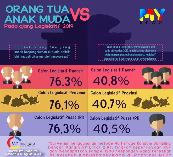 Lembaga Penelitian dan Survei MY Institute melakukan survei politik pada periode Juni-Agustus 2018 yang bertema “Penilaian Masyarakat NTB terhadap sosok calon legislatif yang akan bertarung pada pileg 2019 mendatang”. Survei ini menggunakan Metode Multistage Random Sampling dengan Margin of Error 2,6%, tingkat kepercayaan 95% dan mendapatkan 1200 responden yang tersebar di seluruh Kabupaten/Kota se-Nusa Tenggara Barat.