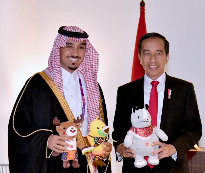 Presiden Joko Widodo menerima kunjungan Pangeran Abdulaziz bin Turki Al Faisal bin Abdulaziz Al Saud, Wakil Ketua Dewan Olah Raga Arab Saudi sebelum menghadiri Pembukaan Asian Games di Stadion Utama Gelora Bung Karno (GBK), Jakarta, 18 Agustus 2018. Pangeran yang sekaligus cucu Raja Faisal bin Abdulaziz Al Saud itu datang mewakili Sri Baginda Raja Salman untuk menghadiri pembukaan pesta olah raga terbesar se-Asia tersebut. Dalam pertemuan yang berlangsung di Cofftea House, Kompleks GBK itu, Presiden menyampaikan terima kasih atas kehadirannya dan apresiasi terhadap dukungan Arab Saudi terhadap penyelenggaraan Asian Games. “Arab Saudi mengirim kontingen sekitar 140 orang dengan mengikuti berbagai cabang olah raga dan salah satu andalannya sepak bola,” ujar Presiden Jokowi.