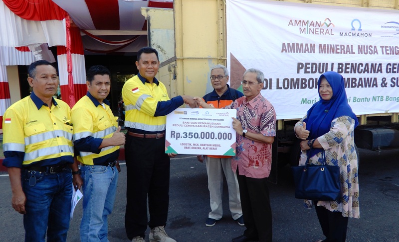 Amman Mineral Nusa Tenggara (AMNT) dan Aliansi secara simbolis menyerahkan bantuan kemanusiaan peduli gempa Kabupaten Sumbawa pada Jum’at (31/8) di Halaman Kantor Bupati Sumbawa. Total bantuan senilai Rp 350 juta yang diberikan dalam bentuk barang serta perlengkapan yang dibutuhkan masyarakat Sumbawa tersebut diserahkan Senior Manager Social Responsibility Amman Mineral H. Syarafuddin Jarot kepada Bupati Sumbawa, HM Husni Djibril B.Sc yang didampingi Kepala BPBD Drs. Zainal Arifin, Kadis Sosial Tri Karyati S.Sos Kabag Humas dan Protokol Setda Sumbawa, Tajuddin SH.