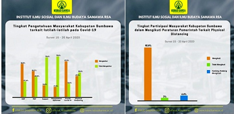 Ditambahkan Kepala LRPM IISBUD Sarea, Samsudin M.Pd, bahwa survei ini penting untuk dilakukan. Berdasarkan pengamatan, sejak pertama kali informasi Covid-19 ini tersebar di Kabupaten Sumbawa, ada beragam reaksi yang dilakukan dari tingkatan pemerintah daerah, legislatif, beberapa lembaga kemanusiaan, relawan yang berasal dari berbagai kalangan serta masyarakat itu sendiri. Beragam reaksi tersebut terbilang semuanya positif, dari penyemprotan disenfektan, pembagian sembako bagi masyarakat terdampak, pembagian masker dan kegiatan positif lainnya. Namun, dari hasil survei IISBUD Sarea, ada yang tidak kalah penting, yaitu edukasi terkait penyebaran, cara mencegah dan istilah-istilah ilmiah yang sering muncul di media maupun yang bermunculan di baliho-baliho terkait covid-19 yang sudah menyebar di seluruh desa. Misalnya ketika tim survei menanyakan terkait bagaimana seseorang dinyatakan positif Covid-19, masih ada 32,6% masyarakat belum mengetahuinya dan proses pengambilan spesimen ada 78,6% masyarakat yang tidak mengetahui alurnya. Belum lagi ketika ditanyakan istilah physical distancing ada 52,4% masyarakat yang tidak mengetahui artinya. Padahal kegiatan tersebut sudah dan sedang mereka lakukan, namun pengetahuan-pengetahuan itu terbatas karena tidak dibersamai dengan edukasi istilah-istilah dan alur dalam menghadapi Covid-19.
