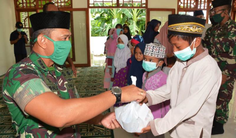 Upaya pencegahan penyebaran virus corona atau corona virus desease (Covid-19) di wilayah Nusa Tenggara Barat terus dilakukan. Di sela-sela peninjauan progress percepatan rehab rekon rumah tahan gempa (RTG) oleh Satgas Zeni TNI di beberapa lokasi di Kabupaten Lombok Utara, Komandan Korem 162/WB Kolonel Czi Ahmad Rizal Ramdhani, S.Sos. SH. M.Han., didampingi Dandim 1606/Lobar Kolonel Czi Efrijon Kroll, S.IP., melaksanakan imbauan pencegahan Covid-19 dan membagikan masker. Selain itu menyerahkan bingkisan kepada anak-anak yatim di Masjid Babussalam Kecamatan Banyan KLU, Sabtu (11/4).