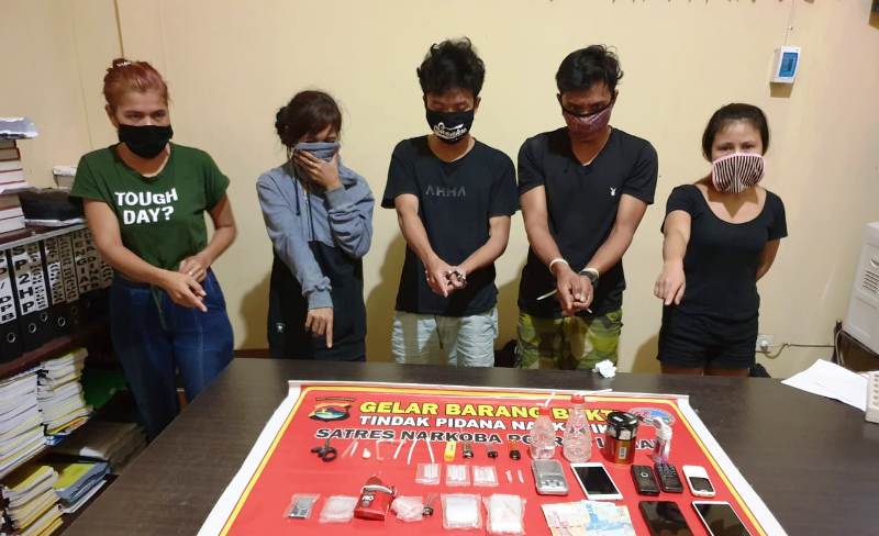Dua orang pria dan tiga perempuan dibekuk Satuan Reserse Narkoba Polres Lombok Barat, Kamis (4/6/2020) malam pukul 21.00 Wita. Penangkapan ini dilakukan dalam penggrebekan yang dilakukan polisi di Hotel Nomasitar, jalan raya Senggigi, Dusun Batu Layar, Desa Batu Layar, Kecamatan Batu Layar Lombok Barat. Dalam penangkapan itu diamankan sejumlah barang bukti di antaranya 15 poket shabu seberat 6,31 gram, uang tunai Rp 251 ribu, 2 buah bong, 5 korek gas, 6 pipet, timbangan dan 6 buah HP.