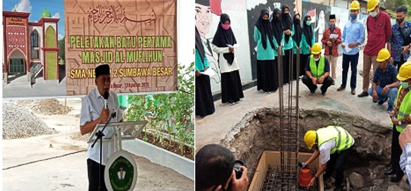 Lantunan sholawat mengiringi dimulainya pembangunan Masjid Al Muflihun SMA Negeri 2 Sumbawa. Pembangunan masjid berlantai dua yang terbilang megah dan luas ini, ditandai dengan peletakan batu pertama yang dilakukan Wakil Bupati Sumbawa, Drs. H. Mahmud Abdullah, Kamis (13/8/2020) pagi tadi. Hadir dalam momen bersejarah itu di antaranya Anggota DPRD Sumbawa, Kadis Dikbud Sumbawa, Kepala Kemenag Sumbawa, Pengurus Ketua Ikatan Alumni SMANDA beserta sejumlah alumni dari angkatan pertama 1981 hingga 2019, Ketua Komite Sekolah dan pengurus, para kepala sekolah, tokoh agama dan tokoh masyarakat. Pada saat yang sama juga dilakukan penanaman beberapa pohon kurma di sekeliling masjid.