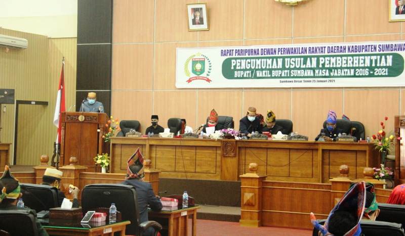 DPRD Kabupaten Sumbawa mengusulkan pemberhentian Bupati dan Wakil Bupati Sumbawa, HM Husni Djibril B.Sc—Drs. H. Mahmud Abdullah, Senin (25/1/2021). Usulan itu disampaikan dalam Rapat Paripurna Dewan Perwakilan Rakyat Daerah (DPRD) Kabupaten Sumbawa Tahun Sidang 2021, dengan agenda Pengumuman Usulan Pemberhentian Bupati/Wakil Bupati Sumbawa Masa Jabatan 2016-2021. Rapat itu dihadiri Wakil Bupati Drs. H. Mahmud Abdullah, Anggota Forkopimda, Sekda, Ketua Pengadilan Negeri, Asisten dan Staf Ahli Bupati, serta Pimpinan OPD dan Kepala Bagian Lingkup Pemerintah Daerah Sumbawa.