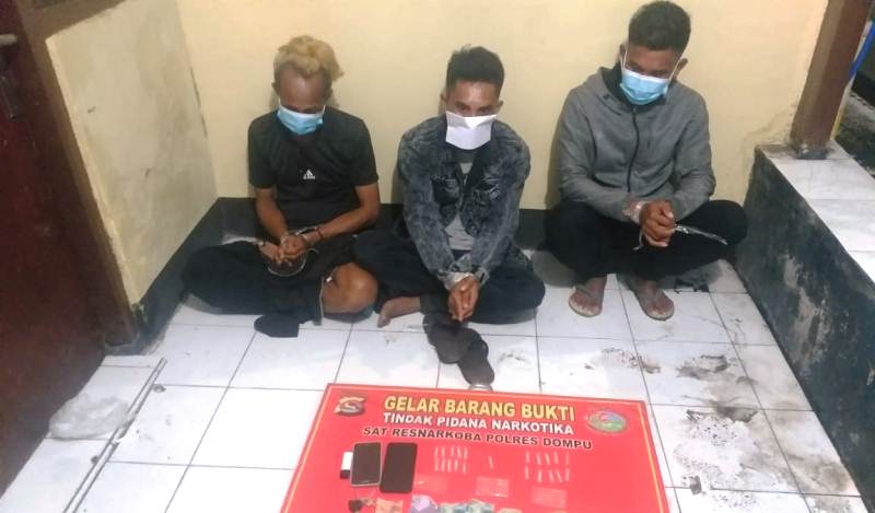 Satuan Reserse Narkotika dan Obat-obatan (Satresnarkoba) Polres Dompu menciduk tiga pria yang diduga hendak bertransaksi narkotika jenis shabu, Selasa (26/1/2021) malam pukul 21.00 Wita. Mereka ditangkap di dalam Salon Bobi—salon kecantikan di Dusun Terawang, Desa Tanju, Kecamatan Manggelewa, Kabupaten Dompu. Tiga pria ini adalah dua orang warga Kecamatan Manggelewa Kabupaten Dompu, AH (28) dan SF (41), serta JR (24) warga Tolo Oi, Kecamatan Tarano, Kabupaten Sumbawa.