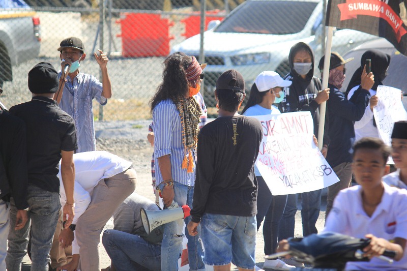 Belasan orang yang tergabung dalam Gerakan Muda Sumbawa Barat (Geram) menggelar aksi unjuk rasa di Gate Benete PT. Amman Mineral Nusa Tenggara (AMNT) yang merupakan akses pintu masuk perusahaan, di Kecamatan Maluk, Sumbawa Barat, Senin (7/6) pagi pukul 08.30 Wita.