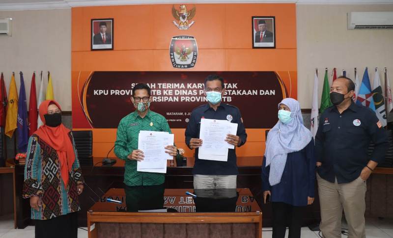 Komisi Pemilihan Umum (KPU) Provinsi NTB menyerahkan 1.746 dokumen penyelenggara demokrasi NTB kepada Dinas Perpustakaan dan Kearsipan (Dispusip) Provinsi NTB, di Kantor KPU setempat, Selasa (8/6).