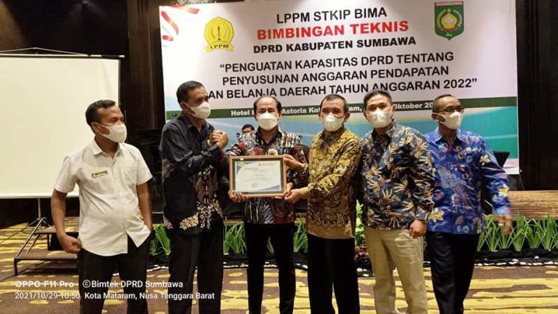 Ketua DPRD Kabupaten Sumbawa Abdul Rafiq memberikan apresiasi kepada H. Ruslan yang akrab disapa Haji Lodot sebagai peserta terbaik pada pelaksanaan Bimbingan Teknis (Bimtek) DPRD Kabupaten Sumbawa, yang dilaksanakan pada 27–30 Oktober 2021.