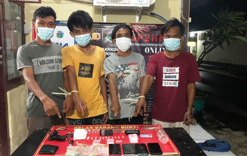 Empat sekawan yang diduga sedang transaksi narkoba jenis shabu, dibekuk Satuan Resnarkoba Polres Dompu, Jumat (19/11). Mereka yang semuanya warga Calabai Kecamatan Pekat, Kabupaten Dompu, ditangkap dalam penggrebekan sebuah rumah. Adalah ES alias Gede, JLD alias Jung, GYB alias Yudi dan AG alias Adul.