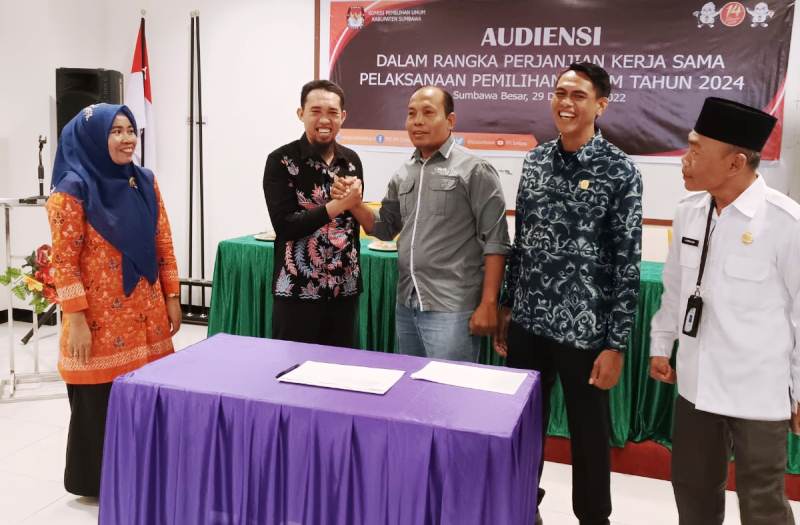SUMBAWA BESAR, samawarea.com (30 Desember 2022)–KPU Kabupaten Sumbawa terus bersinergi untuk kelancaran tahapan maupun kesuksesan pemilu serentak 2024 mendatang. Salah satunya melakukan perjanjian kerjasama pelaksanaan pemilu dengan seluruh pemangku kepentingan (stakeholder).