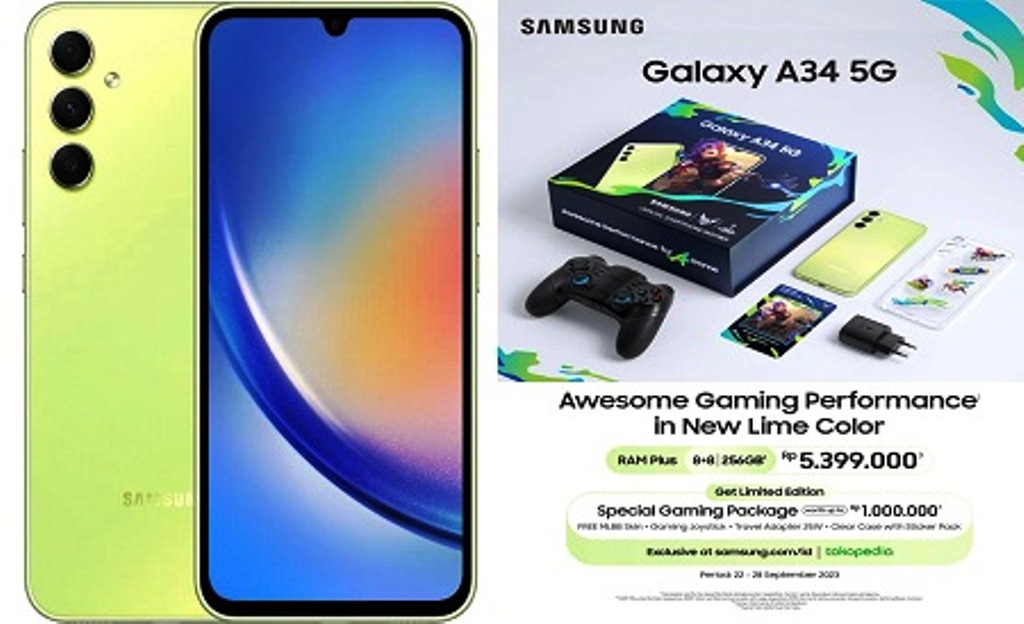 Nikmati ‘kesegaran’ baru Samsung Galaxy A34 5G edisi warna Awesome Lime seharga Rp5.399.000 mendapat paket gaming edisi terbatas untuk pembelian selama periode 22-28 September 2023