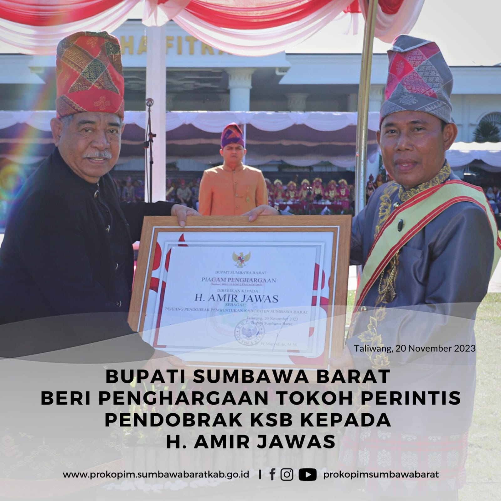 Pada Hari Ulang Tahun Kabupaten Sumbawa Barat yang ke-20, Bupati Sumbawa Barat, Dr. Ir. H. W. Musyafirin.,MM, memberikan penghargaan istimewa kepada H. Amir Jawas. Penghargaan tersebut, diserahkan dalam acara yang digelar Senin, 20 November 2023, di halaman Graha Fitrah Kabupaten Sumbawa Barat.