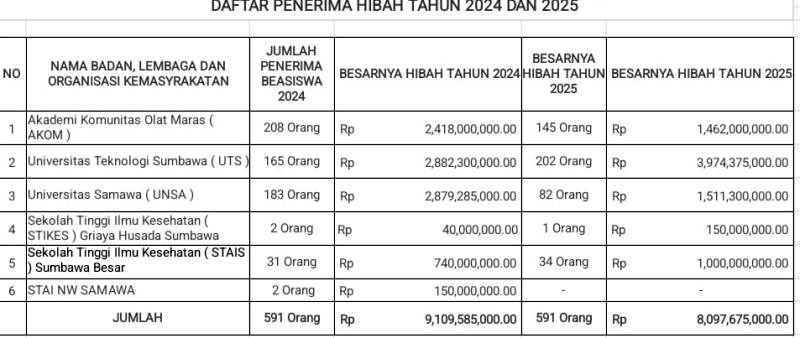 Kemudian tahun 2025, juga dialokasikan hibah yang sama sebesar Rp 8.097.675.000, ditambah dana awal Rp 2.266.250.000 untuk pemberian beasiswa kuliah, khususnya di bidang kesehatan. Ini merupakan bagian dari kerja sama Pemerintah Daerah Kabupaten Sumbawa dengan Universitas Mataram (UNRAM).