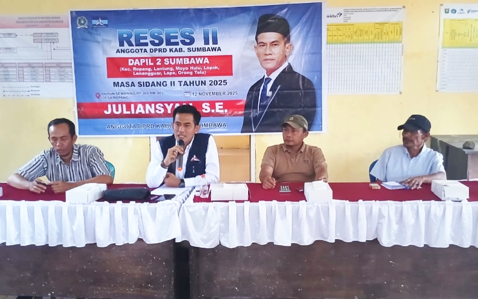 SUMBAWA BESAR, samawarea.com (12 November 2025) – Anggota DPRD Kabupaten Sumbawa dari Fraksi Demokrat, Juliansyah, SE., menyerap aspirasi masyarakat di daerah pemilihannya, tepatnya Desa Ropang Kecamatan Ropang, dalam kegiatan Reses Masa Sidang II Tahun 2025, Selasa (11/11).