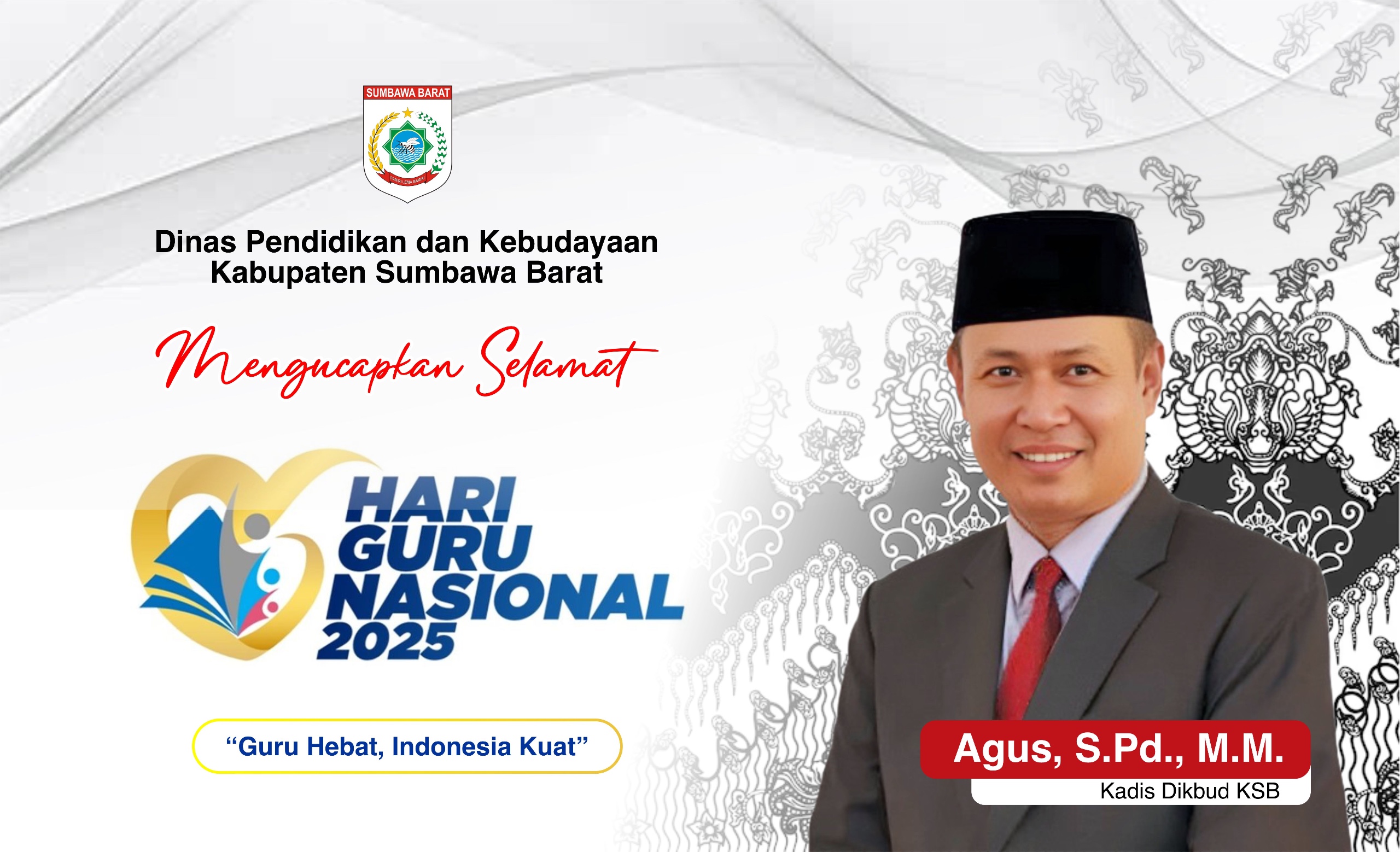 Iklan Ucapan Selamat Hari Guru Nasional November 28, 2025Desember 3, 2025oleh zensumbawa-87 Dilihatoleh zensumbawa Kepala Dinas Pendidikan dan Kebudayaan Kabupaten Sumbawa Barat Beserta Jajaran Mengucapkan Selamat Hari Guru Nasional 2025 Post Views: 87 Jangan LewatkanGubernur NTB Ingatkan Wisudawan UNW, Tantangan Dunia Kerja Kini Hadapi AIDosen Bioteknologi UTS Kembangkan Susu Kuda Liar Sumbawa untuk Energi Terbarukan NasionalCari Bibit Tahan Penyakit, Dosen Bioteknologi dan Konservasi SDA UTS Teliti Bawang Merah SumbawaPastikan Kenyamanan Siswa, Kadis Sosial NTB Tinjau Asrama SRD SumbawaMedia Online SAMAWAREA Sabet 3 Kategori Juara di Cerita Sasambo 2025 ! Bukti Kualitas dan Daya Saing