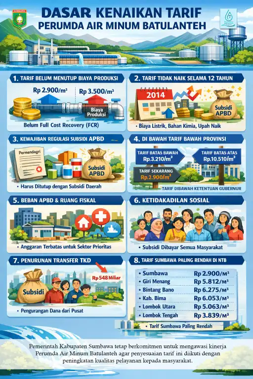 Berdasarkan berbagai pertimbangan teknis, regulasi, fiskal, dan keberlanjutan pelayanan tersebut, Pemerintah Kabupaten Sumbawa akan melakukan kajian komprehensif sebagai dasar penyesuaian tarif air minum Perumda Air Minum Batulanteh.