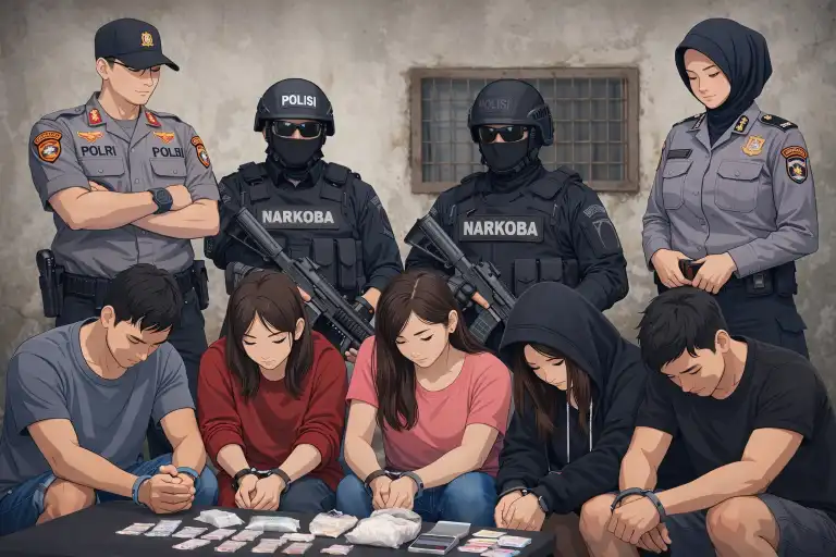 Tim kemudian melakukan penyergapan secara senyap dengan mendekati lokasi melalui area persawahan. Setelah memastikan adanya aktivitas yang diduga pesta narkoba, petugas langsung melakukan penggerebekan dan mengamankan lima orang yang berada di dalam dan sekitar kamar kos.