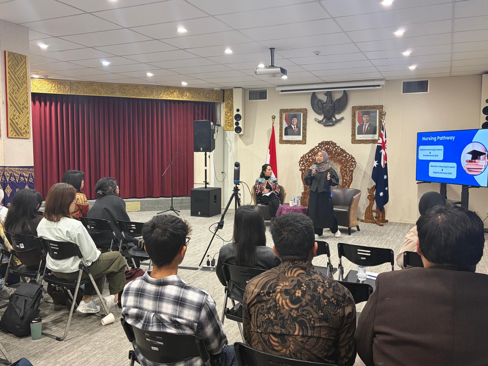 Mereka membagikan wawasan seputar jalur registrasi perawat di Australia, strategi transisi karier, hingga pengalaman langsung bekerja di sistem kesehatan setempat.